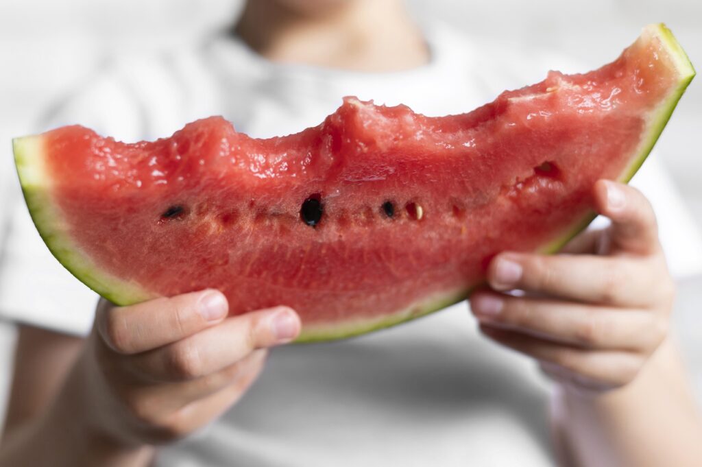 ” แตงโม” เป็นผลไม้ที่มีรสชาติหวานและเย็นสดชื่น เหมาะสำหรับหน้าร้อน เพราะมีน้ำมาก ช่วยเติมน้ำให้ร่างกาย ทำให้สดชื่น อุดมไปด้วยวิตามินเอ วิตามินซี โพแทสเซียม และมีกรดอะมิโนชื่อว่า “ซิทรูไลน์ (Citrulline)” ซึ่งมีประโยชน์สามารถช่วยระบบไหลเวียนโลหิตในร่างกายทำงานได้ดียิ่งขึ้น และยังมีสารไลโคปีน (Lycopene) ที่เป็นสารต่อต้านอนุมูลอิสระช่วยลดความเสี่ยงของการเกิดมะเร็งในส่วนต่างๆ ช่วยดับกระหายคลายร้อย ขับปัสสาวะ โดยผู้สูงอายุควรทานแตงโมครั้งล่ะประมาณ 5-6 ชิ้นแบบพอดีคำ