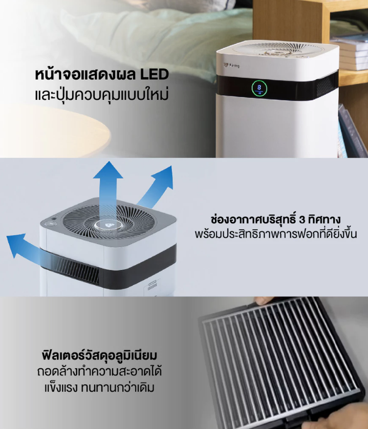 - ช่วยกำจัดสารก่อภูมิแพ้ แบคทีเรีย เชื้อรา กลิ่น และไวรัสได้ 99.99%