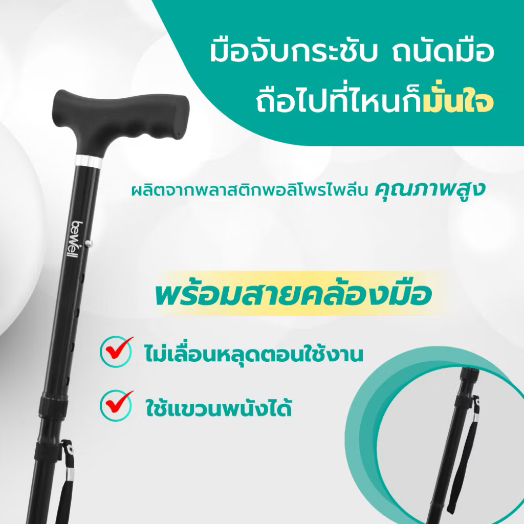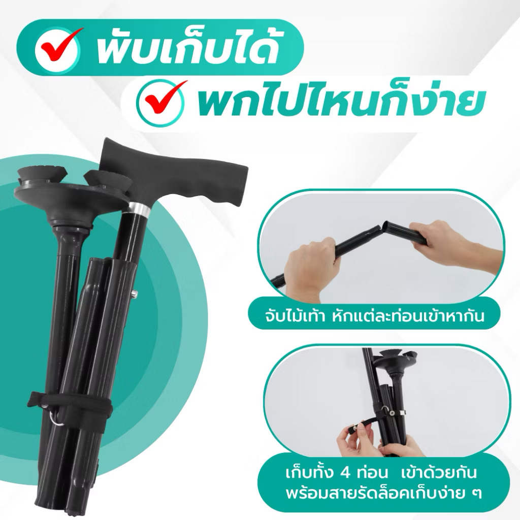 อุปกรณ์ช่วยพยุงการเดิน เพิ่มความมั่นคงและความมั่นใจในทุกย่างก้าว ผลิตจากวัสดุแข็งแรง ทนทาน สามารถพับเก็บได้ 4 ส่วน พกพาสะดวก พร้อมสายคล้องมือ เหมาะสำหรับการใช้งานในชีวิตประจำวัน
