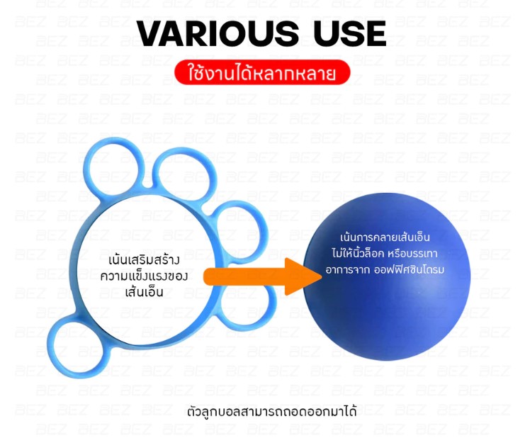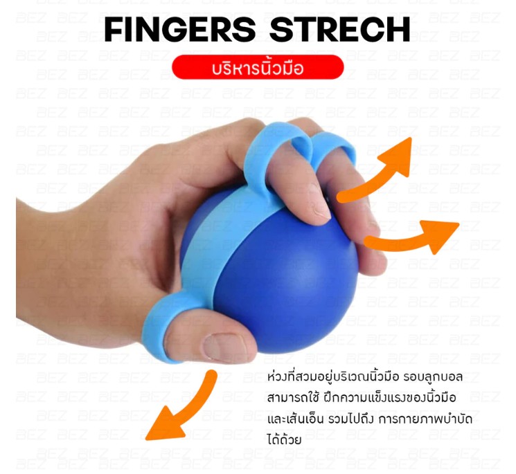 BEZ ลูกบอลบริหารมือ เป็นอุปกรณ์สำหรับฝึกกำลังมือและนิ้วมือ เหมาะสำหรับผู้ที่ต้องการบริหารกล้ามเนื้อมือ รวมถึงการกายภาพบำบัดสำหรับผู้ที่มีอาการมือชา นิ้วล็อก หรือเส้นเอ็นมืออ่อนแรง สามารถใช้ได้ทั้งผู้ที่ทำงานใช้มือบ่อย ผู้ที่มีอาการออฟฟิศซินโดรม รวมถึงผู้สูงอายุที่ต้องการฝึกความแข็งแรงของมือ