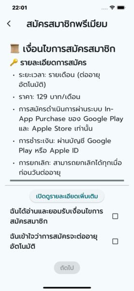 - รายเดือน (ต่ออายุอัตโนมัติ): 129 บาท/เดือน