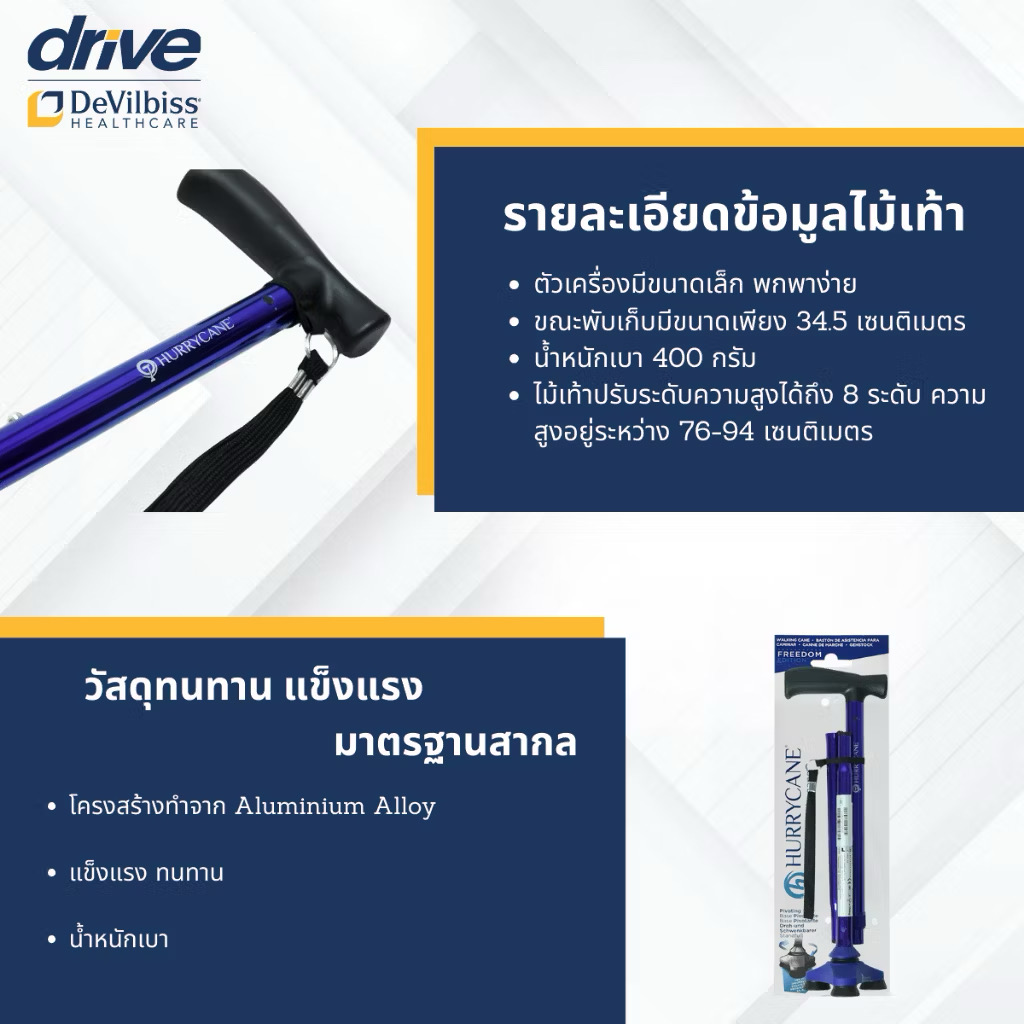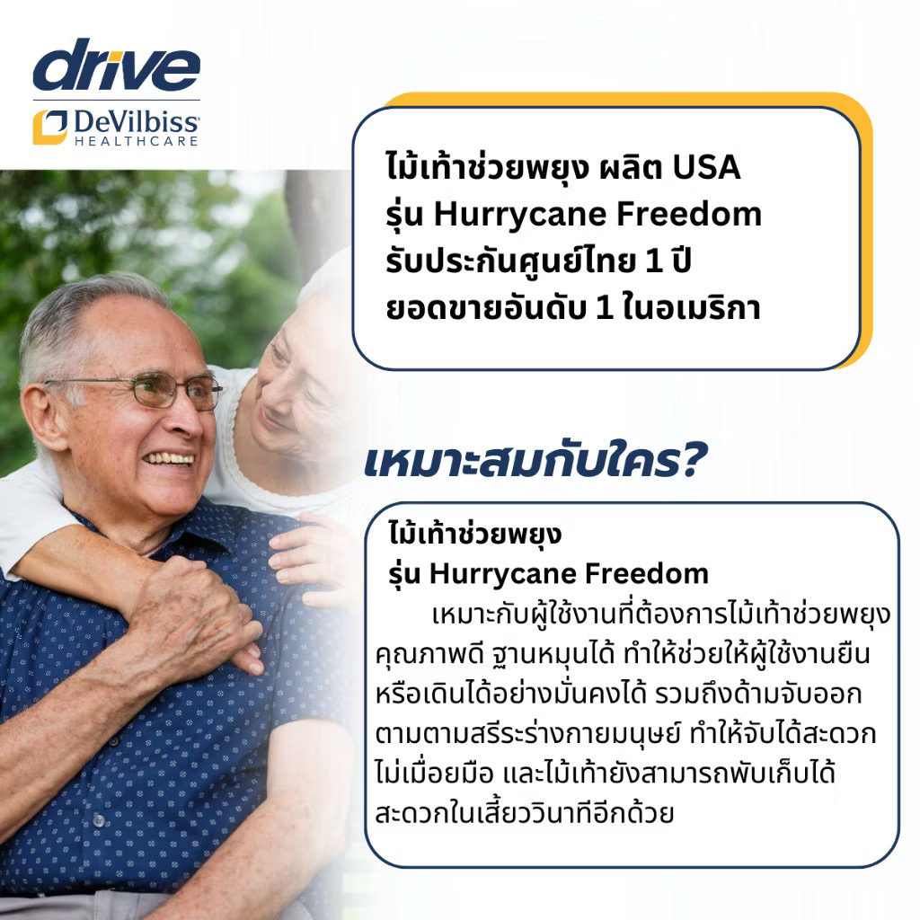 Hurrycane Freedom จาก Drive DeVilbiss เป็นไม้เท้าช่วยพยุงที่ออกแบบมาเพื่อเพิ่มความมั่นคงและความปลอดภัยในการเดินของผู้สูงอายุ ด้วยดีไซน์ทันสมัย น้ำหนักเบา และฟังก์ชันที่ตอบโจทย์การใช้งานในชีวิตประจำวัน สามารถพับเก็บได้ ช่วยให้พกพาสะดวก เหมาะสำหรับทั้งการใช้งานภายในบ้านและนอกสถานที่