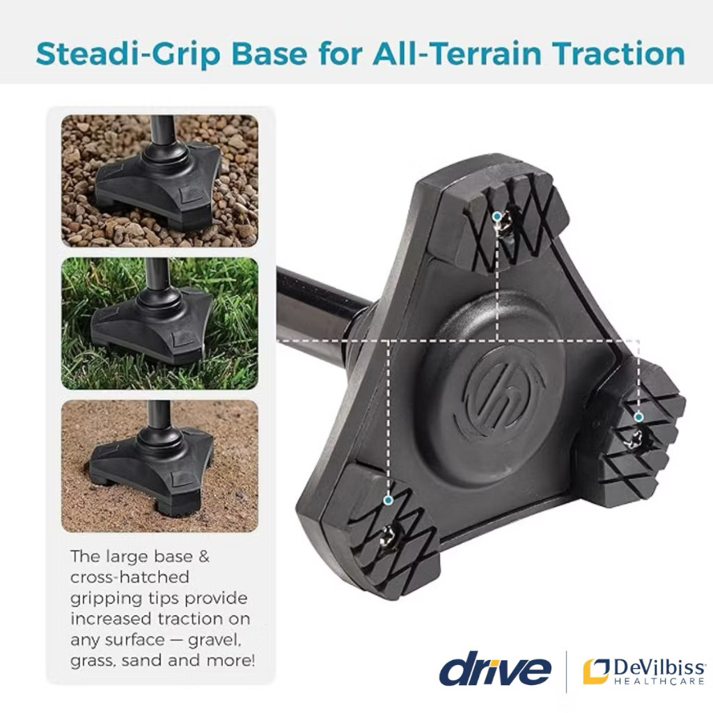 - ฐานไม้เท้าออกแบบให้มีจุดรองรับการทรงตัว 3 จุด ช่วยกระจายน้ำหนักและเพิ่มความมั่นคงขณะยืนและเดิน