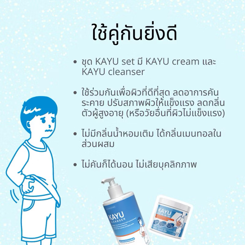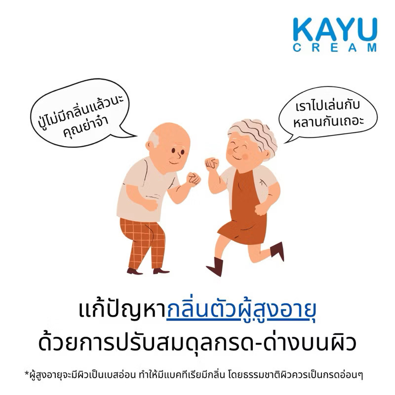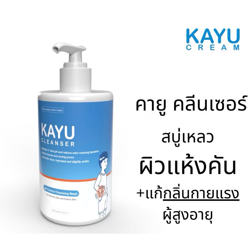 คายูคลีนเซอร์เป็นสบู่เหลวที่ออกแบบมาให้ไม่เป็นด่าง ไม่ชะล้างไขมันตามธรรมชาติ ช่วยลดปัญหาผิวแห้งคัน และปรับสมดุลกรด-ด่างบนผิวให้เป็นกรดอ่อนๆตามธรรมชาติ ผู้สูงอายุหรือคนที่ผิวอ่อนแออาจมีผิวเป็นเบสอ่อนๆทำให้มีกลิ่นจากแบคทีเรียที่เติบโตในสภาพด่าง