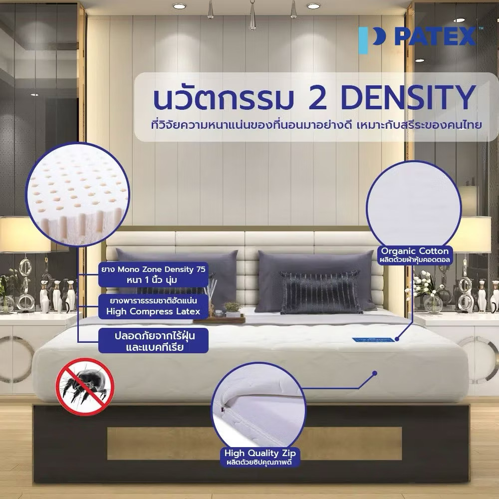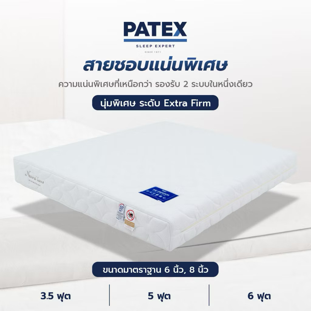 ความหนามาตรฐาน : เลือกได้ทั้ง 6 นิ้ว หรือ 8 นิ้ว – ขนาดมาตรฐาน : มีทุกขนาด 3.5×6.5ฟุต, 5×6.5ฟุต , 6×6.5 ฟุต – PATEX Care รับประกันสูงสุด 12 ปี