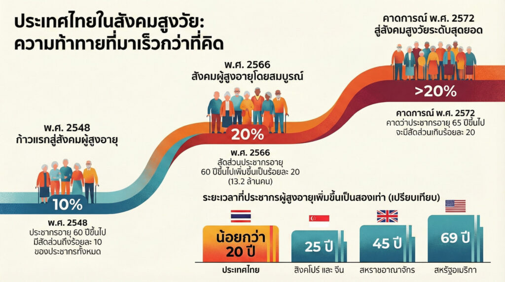 จากรายงานล่าสุดพบว่าในปี 2023 ไทยมีผู้สูงอายุวัย 60 ปีขึ้นไปมากกว่า 13 ล้านคน หรือคิดเป็นประมาณ 20% ของประชากรทั้งหมด ซึ่งจัดอยู่ในสถานะสังคมผู้สูงอายุสมบูรณ์ (Aged Society) แล้ว และคาดการณ์ว่าภายในปี 2031–2033 อัตราส่วนผู้สูงอายุจะเพิ่มขึ้นจนเข้าข่ายเป็น Super Aged Society โดยมีผู้สูงอายุประมาณ 28% ของประชากรทั้งหมด
